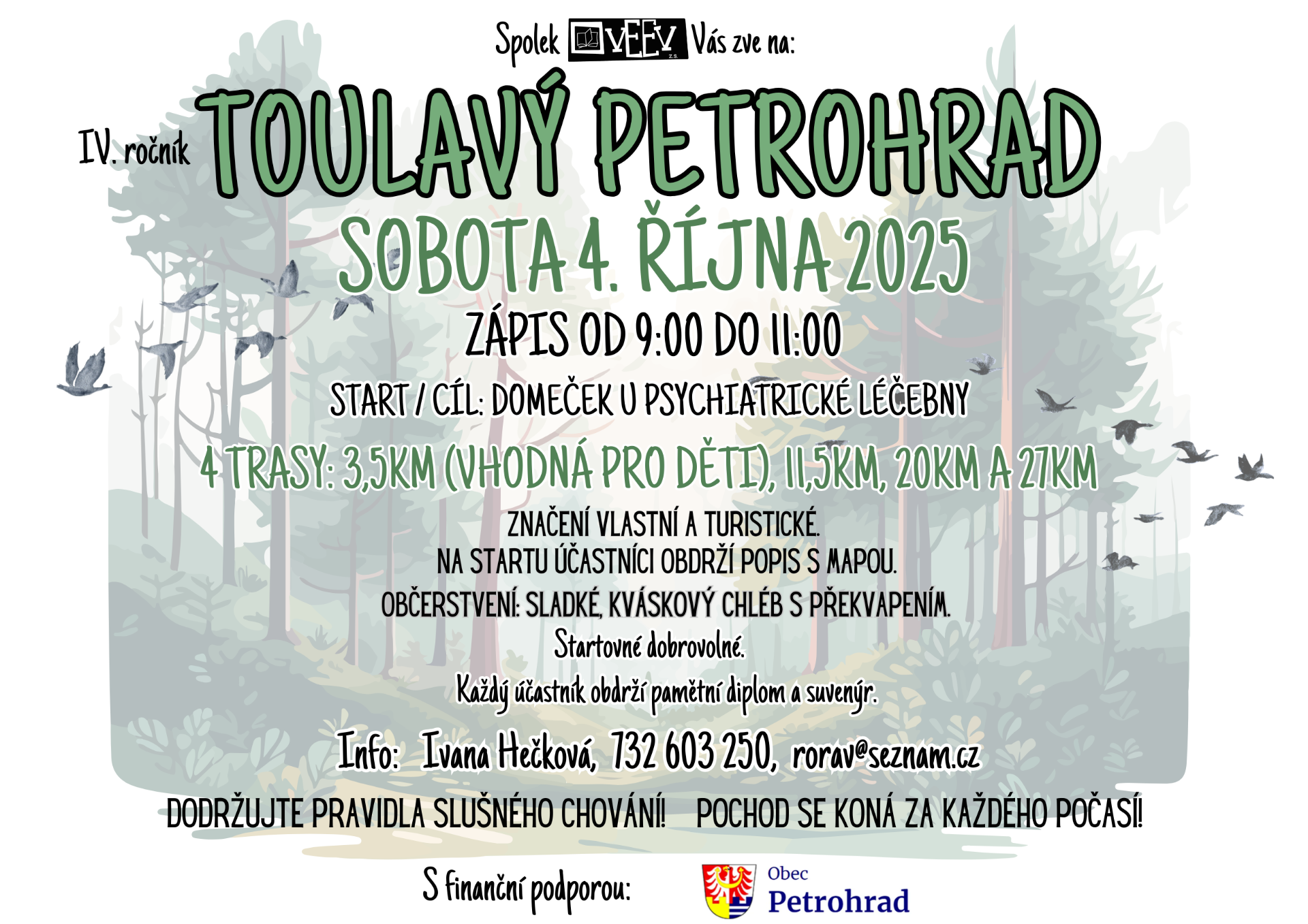 V sobotu 20.9.2025 spolek VEEV,z.s. uspořádal tradiční Pohádkově strašidelný les, který navštívilo téměř 110 dětí. Pro všechny byl připraven pestrý program. Před samotnou strašidelnou stezkou si nejmladší mohli dopřát skákací hrad, projížďku na koni, malování na obličej, Divadlo Ve tři nebo také zmrzlinu. Všechny tyto atrakce byly pro účastníky připraveny zdarma. Ten , kdo se nakonec odvážil vstoupit do petrohradského lesa zažil nezapomenutelný zážitek. Na cestě na každého čekala například ježibaba s Mařenkou, Večerníček, pirátky, kostlivci nebo také pravěcí lidé. Samozřejmě, že nesmělo chybět peklo, bez kterého by to nemělo to pravé kouzlo.